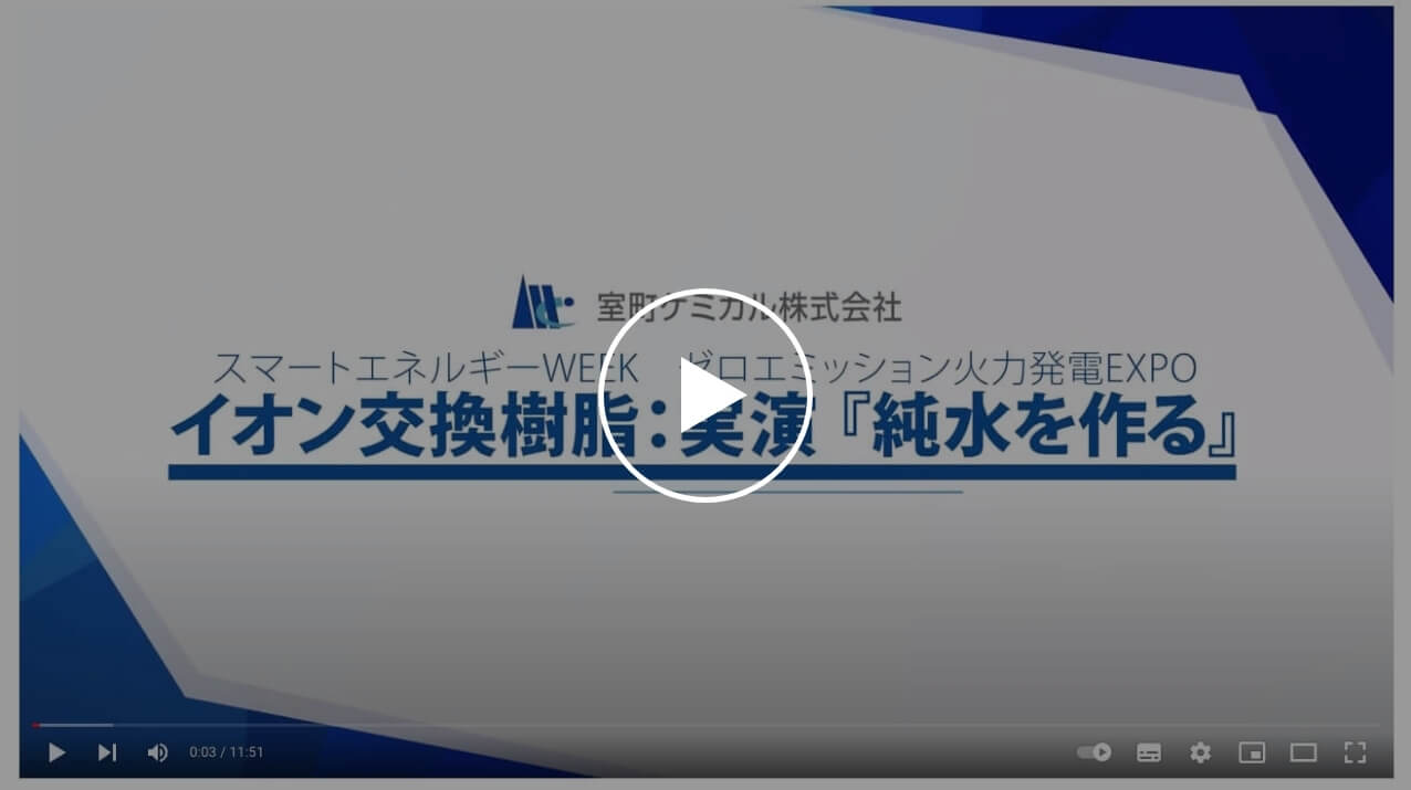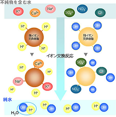 水中にはプラスに帯電したナトリウムなどの+イオンと、マイナスに帯電した塩素などの-イオンが存在します。+イオンを吸着する陽イオン交換樹脂と、-イオンを吸着する陰イオン交換樹脂がそれぞれ働き、最終的にイオンをほとんど含まないきれいな水:純水が出来上がります。