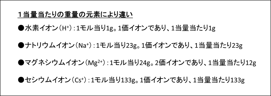 標準的なカチオン交換樹脂のイオン交換容量は1ℓあたり2当量程度です。元素により吸着可能量は異なり、カチオン交換樹脂1ℓあたりナトリウムイオンであれば46g、マグネシウムイオンであれば24g、セシウムイオンであれば266g、吸着可能となります。従ってこの数値を見ることで、ある体積のイオン交換樹脂を使用した場合、どの程度の量のイオンを吸着できるかが概略、分かることになります。