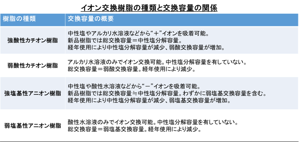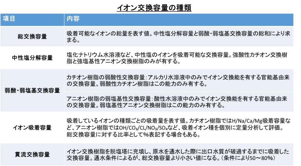「イオン交換容量」を表す言葉にはいくつかの種類があります。それぞれ意味が異なりますので、目的に応じて用いる必要があります。また、イオン交換樹脂の種類により、交換容量も異なります。これらを整理すると次のようになります。