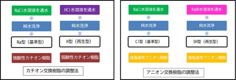 イオン交換容量を測定する場合、まずはイオン交換樹脂を純水中に浸漬して一晩程度放置して水になじませる必要があります。その上で体積を標準化するために、以下の様な処理を行います。樹脂毎に測定の基準となる吸着イオンが異なります。そのため、事前に薬品を通水してイオン形を揃える操作が必要です。