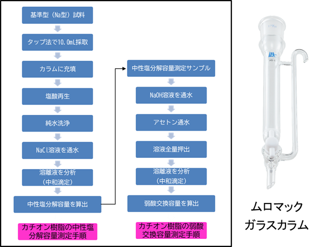 イオン交換容量を測定する方法は色々な方法がありますが、一般的にはカラムにイオン形を調整したイオン交換樹脂を充填して、薬品を通水してイオン交換樹脂を通過した溶液を分析することでイオン交換容量を算出します。
