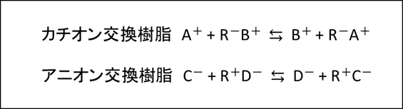イオン交換樹脂は内部に移動可能なイオンを持っていて、カチオン交換樹脂は+イオン、アニオン交換樹脂は-イオンです。これが水に接触すると、水中に含まれるイオンと交換することで「イオン交換反応」が起こります。イオン交換樹脂の母体を有機物全般を示すRとして、+イオンをAとB、-イオンをCとDとすると、イオン交換反応は次のように書くことが出来ます。