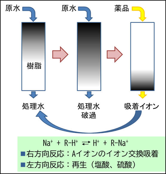 イオン交換樹脂は、水中に存在する不純物のイオンをイオン交換反応により吸着し、水を浄化するなどの目的で使用されています。このイオンを吸着する能力ですが、吸着容量には限界があります。しかし、限界が達した時点で薬品による「再生」操作を行うことで、再利用が可能になります。