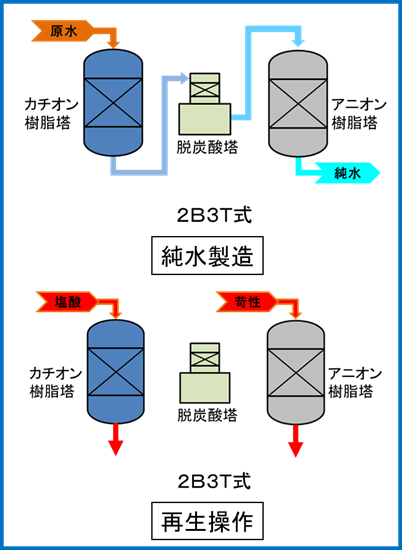2B3T式の脱塩装置では、前段のカチオン樹脂塔で+イオンを除去し、後段のアニオン樹脂塔でーイオンを除去します。原水をある程度の期間通水した時点で通水を止め、カチオン樹脂とアニオン樹脂をそれぞれ塩酸と水酸化ナトリウム(苛性ソーダ)で再生します。その後、純水で十分に洗浄を行い、通水を再開します。
