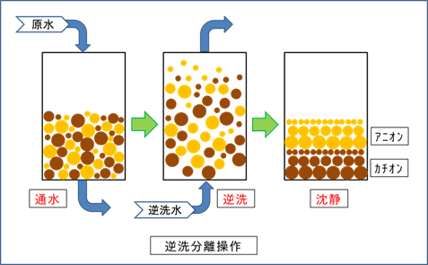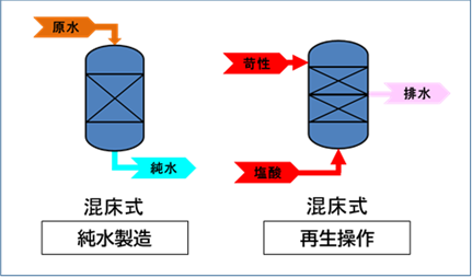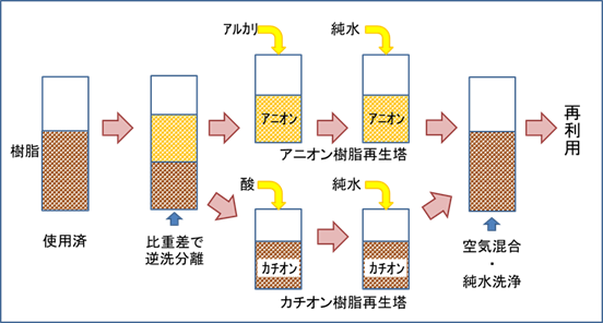 一方、カチオン樹脂とアニオン樹脂を混合状態である混床で使用している場合には、事前にカチオン樹脂とアニオン樹脂を分離した上で再生操作を行います。