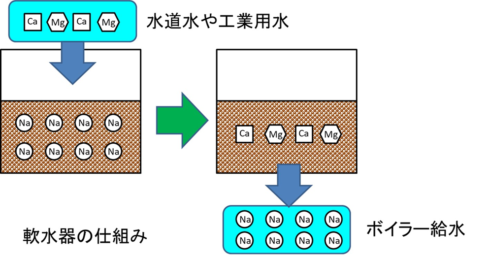 湯垢は、水中に含まれるカルシウムやマグネシウムなどの硬度成分の炭酸塩が水の沸騰と共に濃縮し、固形化したものでスケールと呼ばれます。このスケールが蓄積すると、伝熱効率が低下して発電効率が低下したり、機器構成材料腐食などの原因となります。食堂や工場などで使用されている小型ボイラーには、「軟水器」が設置されています。この装置にはカチオン交換樹脂が使用されていて、水中に存在するカルシウムやマグネシウムなどの硬度成分をイオン交換反応により除去して、スケールが蓄積することを防止しています。軟水器では硬度成分の除去に限界があるため、定期的に食塩で再生操作を行い、再利用しています。