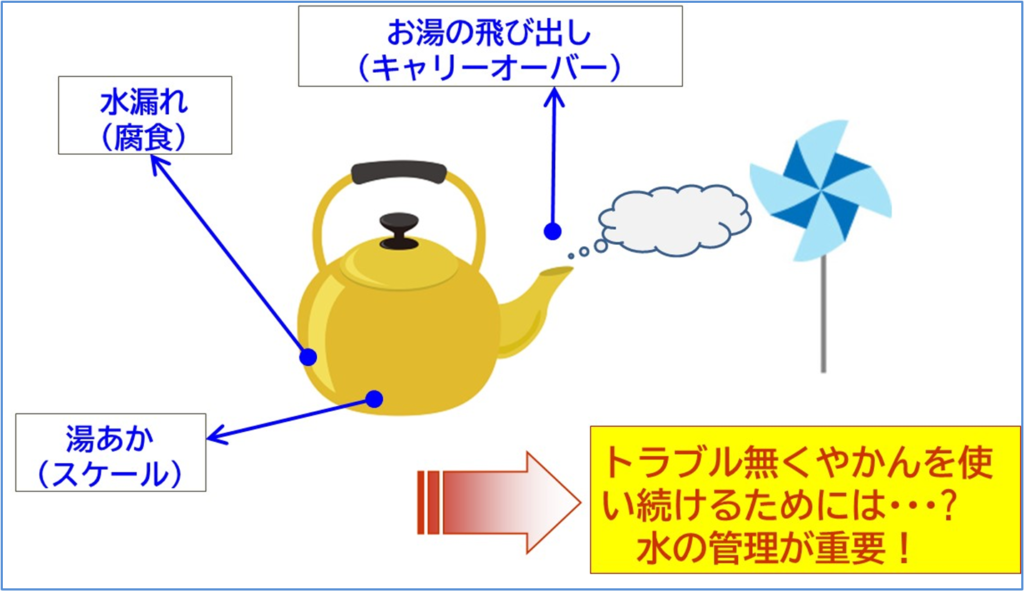 水道水や工業用水中には、硬度成分以外の不純物も存在します。お湯を沸かし続けると、その不純物が濃縮し蓄積します。すると、やかんの材料である金属が徐々に腐食し、進行すると最終的には穴が開いてしまいます。 また、硬度成分やそれ以外の不純物が蒸気と共に蒸発する「キャリーオーバー」事象が発生してしまいます。火力発電所の場合、蒸気は高速で回転する大量の羽根を有するタービンに運ばれるため、蒸気中に不純物が存在するとその不純物がタービン羽根に付着し、タービンの性能を低下させることになりかねません。この原因として挙げられる不純物例としては、塩化ナトリウムなどの海水由来成分や、シリカ、鉄など天然に多く存在する物質になります。