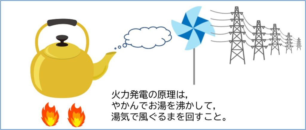 私たちは電気のある生活を日々送っています。それどころか、電気は生活する上で必要不可欠なものです。最近では、太陽光や風力などの再生可能エネルギーに注目されていますが、日本では石油や天然ガスなどを用いた火力発電や、原子力発電に頼っている現状にあります。 発電の原理は、やかん(ボイラー、原子炉)でお湯を沸かして湯気(蒸気)を作り、そのエネルギーで風車(タービン)を回し、発電機で回転エネルギーを電気エネルギーに変換するものです。