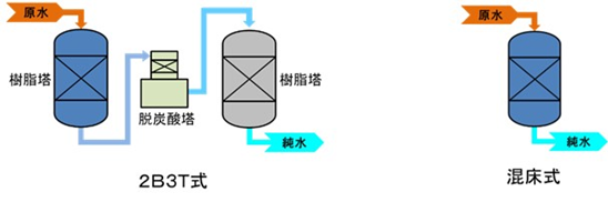 まずは、発電設備に純水を供給するために「純水装置」を使用します。工業用水を「2B3T式」と呼ばれる構成の装置などで純水を製造します。これをプラントに供給することで、水中の不純物に起因するトラブルを回避します。