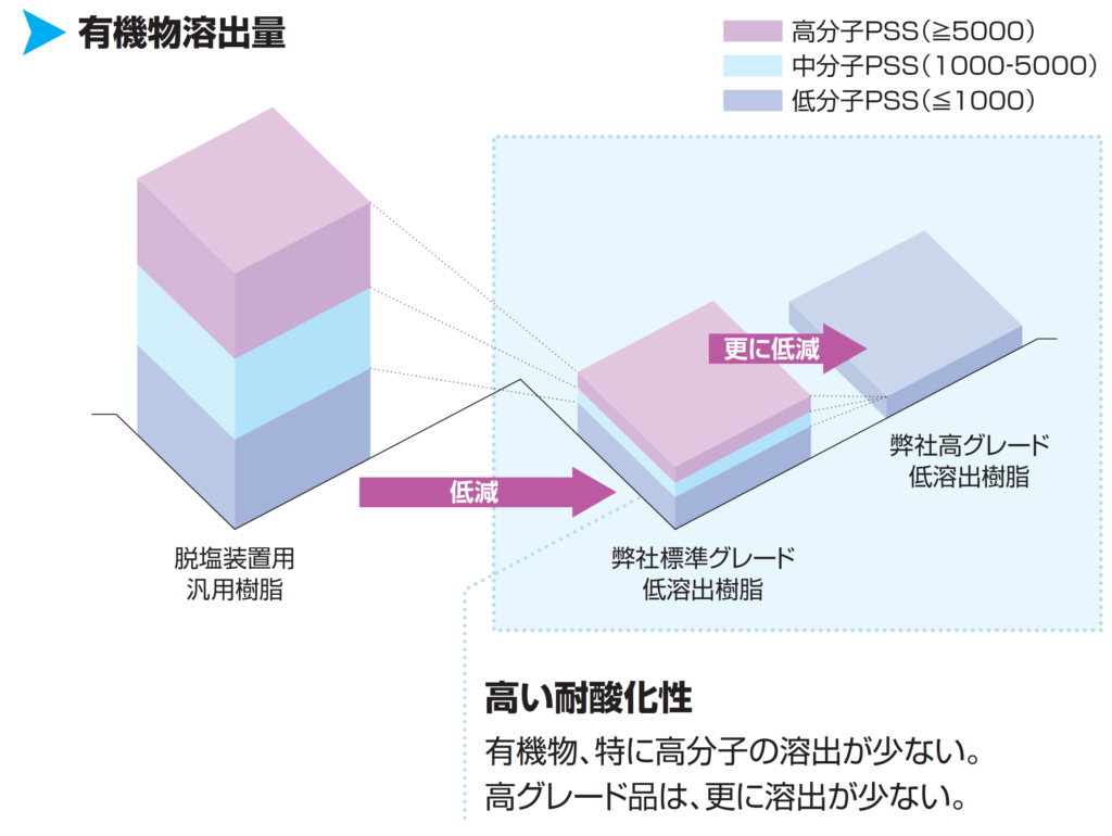 これを回避するために開発されたのが「高架橋度カチオン交換樹脂」になります。これは、イオン交換樹脂の母体構造の重合度を高めることで、優れた化学的安定性を発揮するものです。標準的なカチオン交換樹脂と比較して溶出する不純物量が少なく、長期間使用しても劣化が進行しにくい特徴を有しています。加えて、単位体積当たりの交換容量も大きいことも特徴として挙げられます。