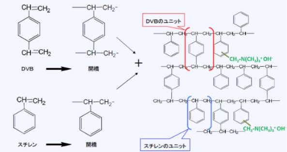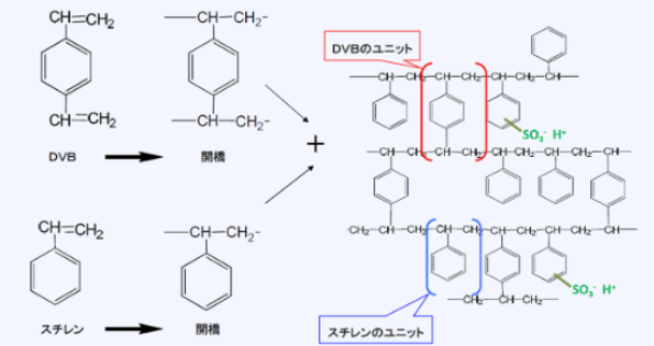 イオン交換樹脂は、主にスチレンとジビニルベンゼン(DVB)を重合した共重合体が用いられます。DVBはポリスチレンを橋架けするためのもので、物理・化学的に安定となります。こうして出来たコポリマー(架橋ポリスチレンと呼ぶ)は疎水性ですが、これに交換基を導入すると、親水性になり水を吸収して膨潤します。