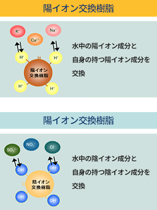 イオン交換樹脂は主に水の軟化や浄化などに利用されるもので、一般にカチオン交換樹脂とアニオン交換樹脂が用いられます。カチオン交換樹脂中にはH+が樹脂中に存在し、このH+が外部溶液中の陽イオン(Na+)とイオン交換反応を示します。アニオン交換樹脂では、樹脂中のOH-が外部溶液の陰イオン(Cl-)とイオン交換を行います。これらにより水中のイオンとイオン交換樹脂中のイオンが交換することとなります。また、ある程度イオンを吸着したところで薬品による「再生」操作を行い吸着しているイオンを元に戻すことにより、繰り返しの使用が可能となります。