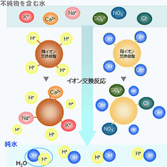 このイオン交換反応を活用し、カチオン交換樹脂とアニオン交換樹脂を混合したイオン交換樹脂層に水を通水することで、カチオン交換樹脂が+イオンであるナトリウムイオンなどを吸着してH+イオンを放出し、アニオン交換樹脂が-イオンである塩化物イオンなどを吸着してOH-イオンを放出します。このH+イオンとOH-イオンが結合して水になり、結果として純度の高い水(純水)を得ることが出来ます。