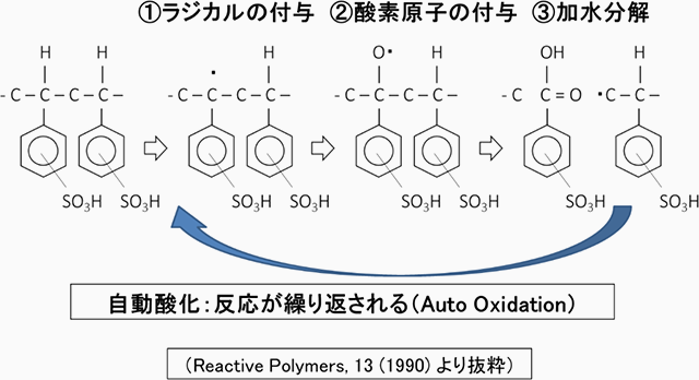 イオン交換樹脂は、水中に存在するイオンなどの不純物を除去してきれいな純水を長期間に渡り製造することが出来ます。しかし、長期間に渡り使用し続けると、プラスチックが光を長期間浴びることでボロボロになるように、イオン交換樹脂も使用と共に徐々に劣化します。特にカチオン交換樹脂は、吸着・捕捉した金属イオンが触媒として働いて酸化劣化を引き起こします。この反応は、以下のように起こると言われています。