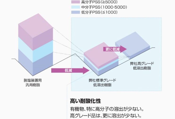これを解決するために開発されたのが「高架橋度低溶出カチオン交換樹脂:ULシリーズ」になります。このカチオン交換樹脂は、従来のものより架橋度を高めることで以下の様な性能を有するものです。