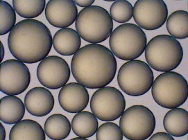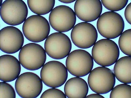 イオン交換樹脂は直径0.3~1.2mm程度の球形物質で、写真に示すように粒径分布が広い範囲であるガウス分布のイオン交換樹脂と、ほぼ粒径が揃っている均一粒径分布のイオン交換樹脂があります。これらはその用途により使い分けしていますが、均一粒径分布のイオン交換樹脂の方が、反応性や再生性など有利な特性を有していることが多いです。