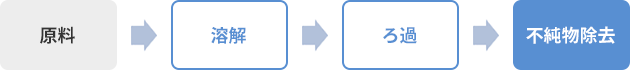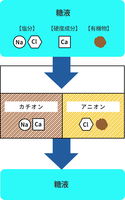 砂糖の原料である糖液中には、糖以外の様々な不純物が含まれています。不純物であるカルシウムや有機酸などを除去する脱塩や軟化についてはイオン交換樹脂の本来の役割ですが、対象とする液が高濃度の糖液であるため、様々な種類のカチオン交換樹脂・アニオン交換樹脂から最適なものが選定されています。脱色については活性炭が主として用いられていますが、これで除去しきれない有機物をアニオン交換樹脂で除去しています。硬度成分はカチオン樹脂で除去し、脱塩はカチオン樹脂とアニオン樹脂が行っています。