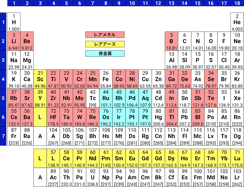これら貴金属、レアメタル、レアアースを周期律表で見ると、以下の元素が該当します。